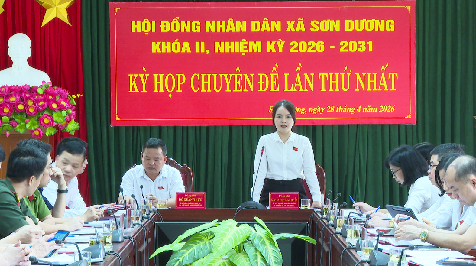 Đồng chí Nguyễn Thị Thanh Huyền, Ủy viên Ban Chấp hành Đảng bộ tỉnh, Bí thư Đảng ủy, Chủ tịch HĐND xã; Đỗ Xuân Thực, Ủy viên Ban Thường vụ Đảng ủy, Phó Chủ tịch HĐND xã đồng chủ trì kỳ họp
