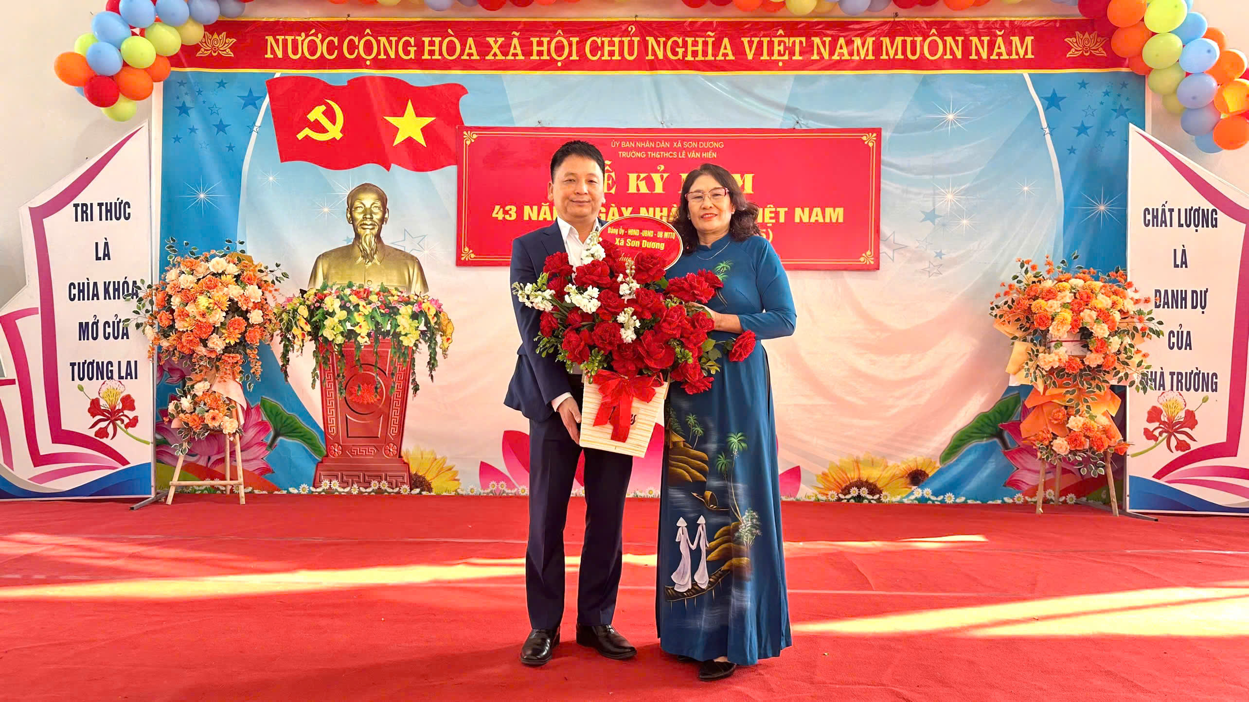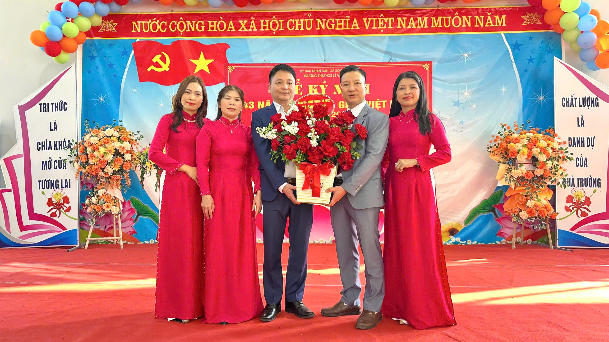 Tại Trường TH&THCS Lê Văn Hiến, đồng chí Phùng Việt Hưng, Phó Bí thư Đảng ủy, Chủ tịch UBND xã tham dự lễ kỷ niệm và tặng lẵng hoa chúc mừng. Ban Giám hiệu nhà trường cảm ơn sự động viên kịp thời, coi đây là nguồn khích lệ để tiếp tục nỗ lực nâng cao chất lượng dạy và học.