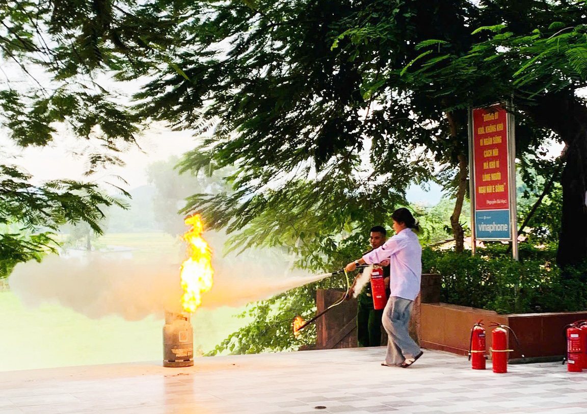 Học sinh trường THPT Sơn Nam thực hành kỹ năng sử dụng phương tiện chữa cháy.