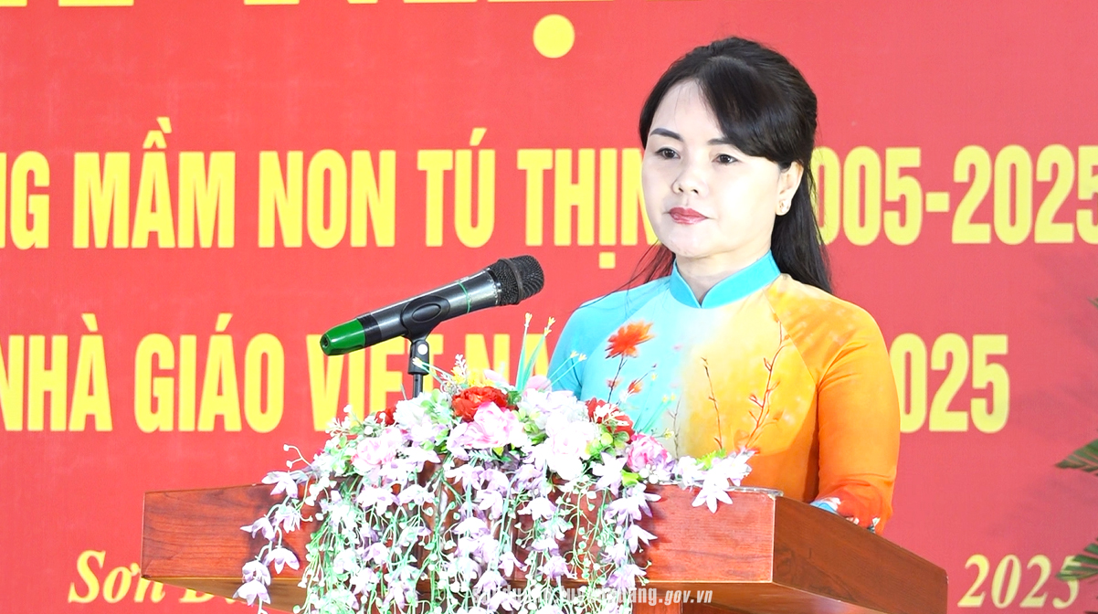 Phát biểu tại buổi lễ, đồng chí Bí thư Đảng ủy Nguyễn Thị Thanh Huyền chúc mừng và biểu dương những thành tích nổi bật mà Trường Mầm non Tú Thịnh đã đạt được trong 20 năm qua. Đồng chí nhấn mạnh rằng, chặng đường hai thập kỷ của nhà trường là minh chứng sống động cho tinh thần đổi mới, sự kiên trì và trách nhiệm của các thế hệ cán bộ, giáo viên – những người đã vượt qua khó khăn để mang đến môi trường giáo dục chất lượng cho trẻ em địa phương. Đồng thời ghi nhận sự nỗ lực của tập thể nhà trường trong việc thực hiện hiệu quả chuyên đề “Xây dựng trường mầm non lấy trẻ làm trung tâm”, đổi mới phương pháp chăm sóc - giáo dục, xây dựng môi trường trải nghiệm phong phú, thân thiện; và đánh giá cao công tác xã hội hóa, sự phối hợp chặt chẽ giữa nhà trường với phụ huynh, tổ chức và cá nhân trong cộng đồng. Đồng chí Bí thư Đảng ủy mong muốn trong thời gian tới, tập thể nhà trường tiếp tục phát huy truyền thống đoàn kết, giữ vững danh hiệu trường chuẩn; tăng cường bồi dưỡng chuyên môn, ứng dụng công nghệ trong dạy học; xây dựng đội ngũ giáo viên tâm huyết, sáng tạo; chú trọng giáo dục kỹ năng sống, hình thành thói quen tốt cho trẻ. Đồng chí tin tưởng rằng Trường Mầm non Tú Thịnh sẽ tiếp tục gặt hái nhiều thành tựu mới, xứng đáng là điểm sáng của ngành giáo dục địa phương.