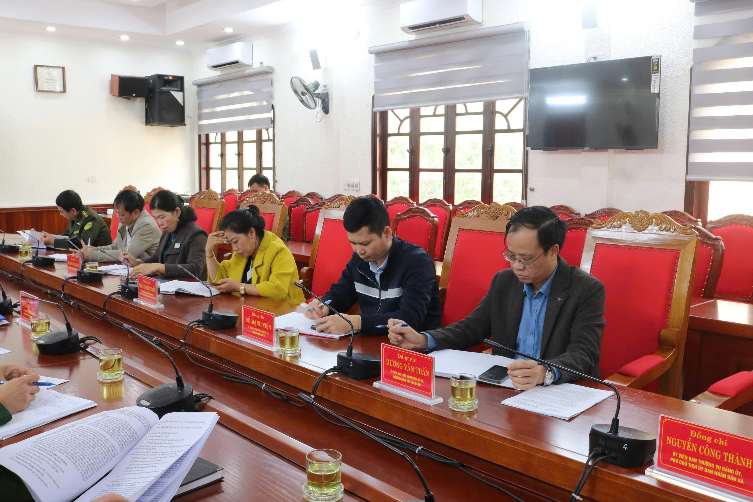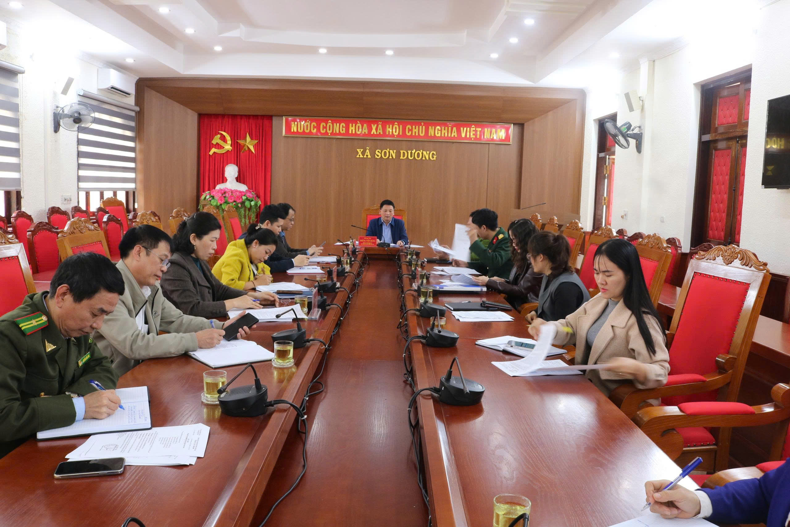 Đồng chí Phùng Việt Hưng, Phó bí thư Đảng ủy, Chủ tịch UBND xã chủ trì cuộc họp.