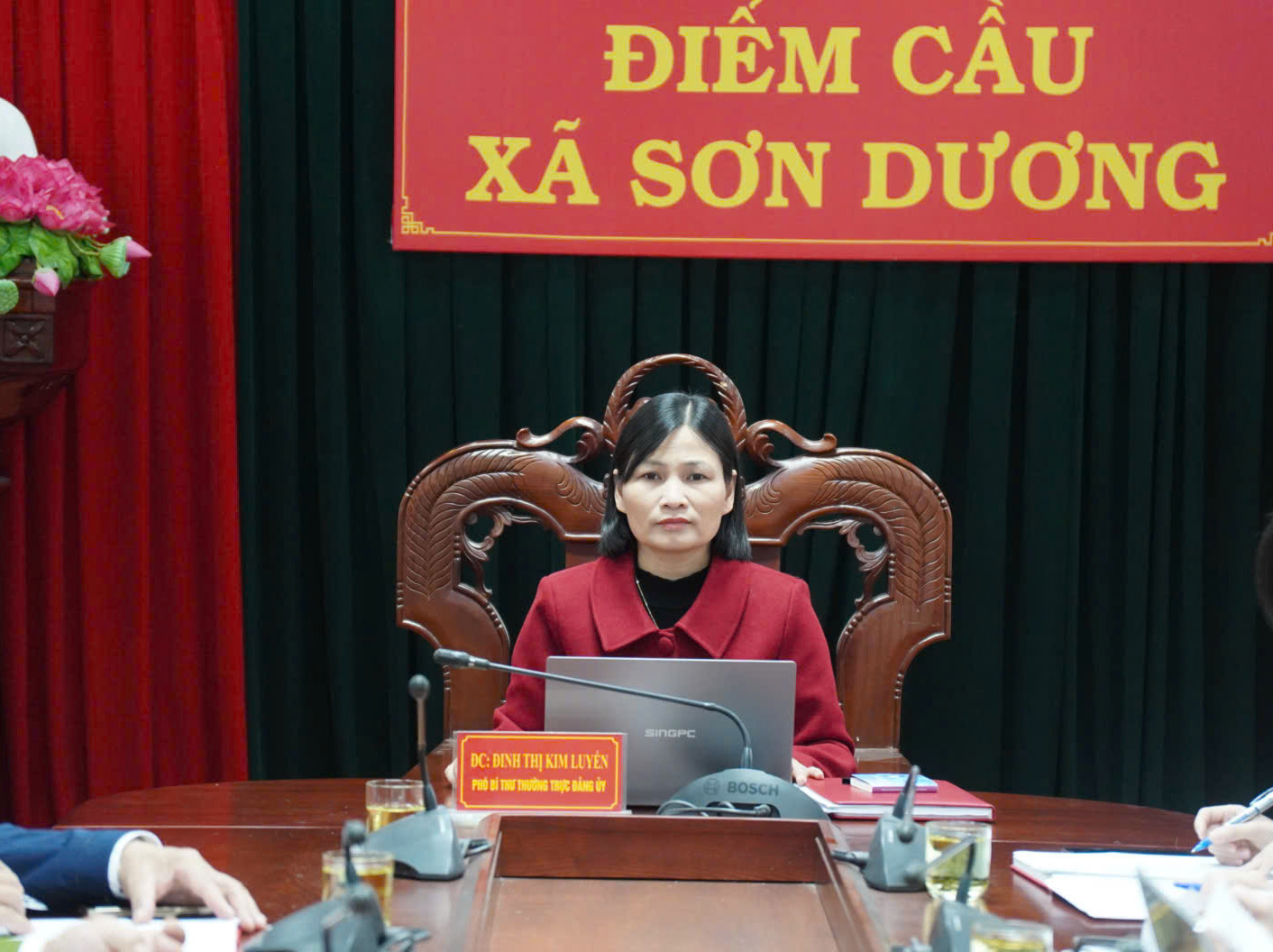Tại điểm cầu xã Sơn Dương, đồng chí Đinh Thị Kim Luyến, Phó Bí thư Thường trực Đảng ủy xã, dự và chủ trì hội nghị. Cùng dự có các đồng chí lãnh đạo, công chức các cơ quan chuyên trách tham mưu, giúp việc Đảng ủy, đại diện lãnh đạo các cơ quan Công an xã, Ban Chỉ huy Quân sự xã, Tòa án nhân dân Khu vực 1 – Tuyên Quang (cơ sở 2), Văn phòng HĐND và UBND xã.